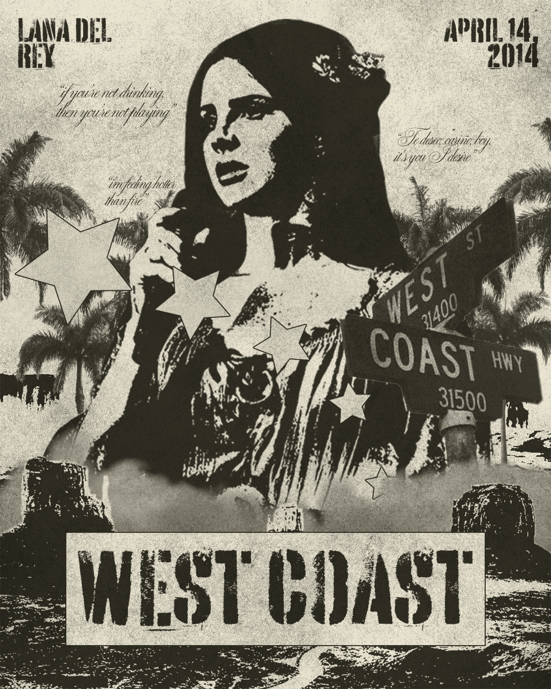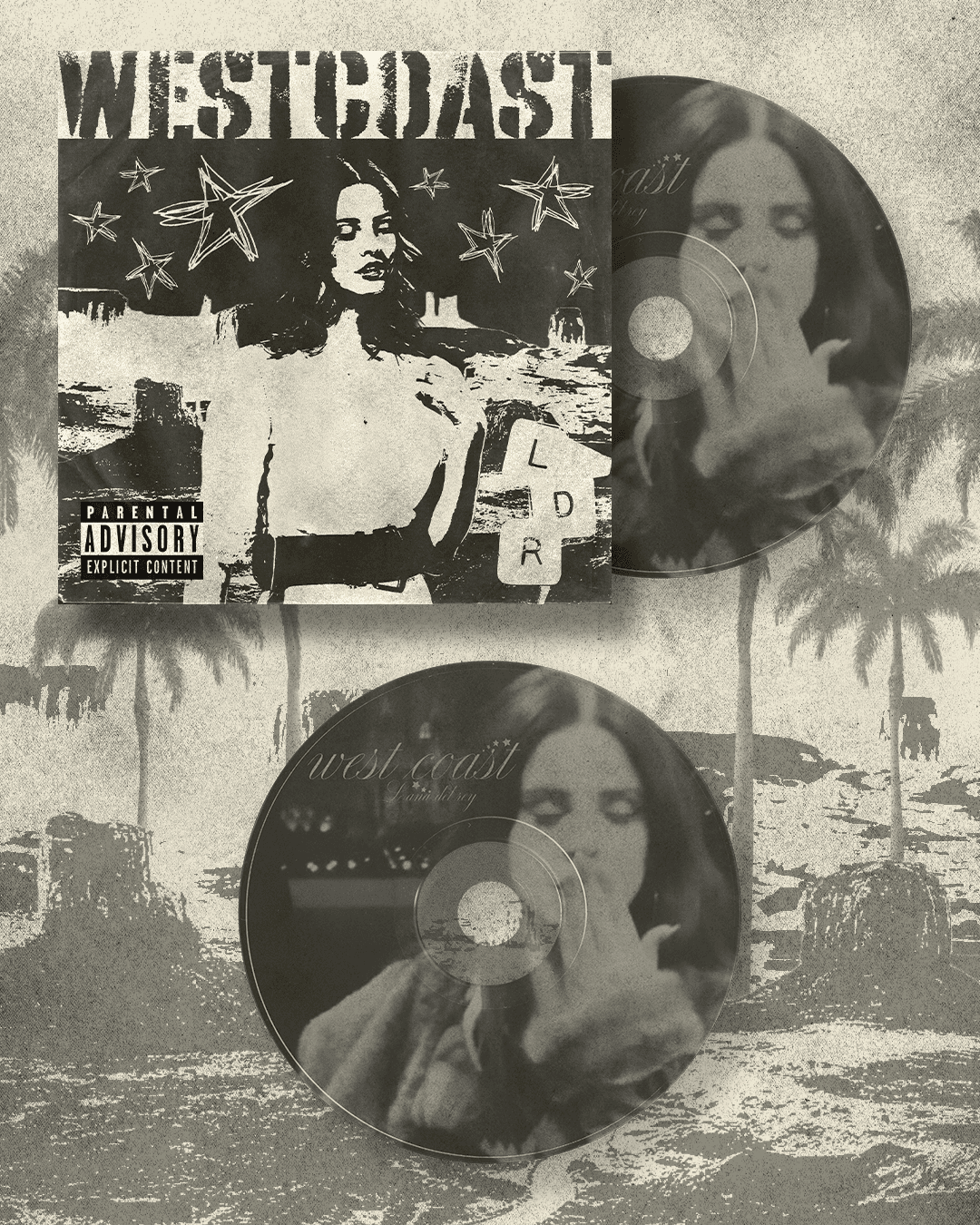 This merchandise collection containing a poster, CD, and shirt, is for the hit song "West Coast" by Lana Del Rey, aiming to capture that nostalgic California feeling by taking inspiration from Western american aesthetics.